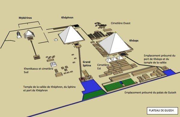 Le plateau de Gizeh est situé à environ 25 km du Caire (autrefois Letopolis), en fait il n'y a pas de différence étant donné que cette ville est une immense mégapole. Il s'étant sur 2000m de côté avec un escarpement de 40m de dénivellation au pied duquel coulait autrefois un canal du Nile, il est maintenant 300m plus loin. Les pyramides de trois rois de la IVème dynastie y ont été construites entre 2649 et 2513 par les pharaons Khéops, Kephren et Mykérinos. Elles sont installées perpendiculaires aux quatre points cardinaux et aucune d'entre elles ne cache jamais le soleil aux autres. Elles mesurent respectivement : 146mx233m pour Khéops (actuellement il lui manque une dizaine de mètres) -136,50mx210,50m pour Képhren, 66mx108 pour Mykérinos, le Sphinx lui mesure 21mx57m.