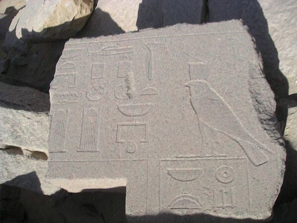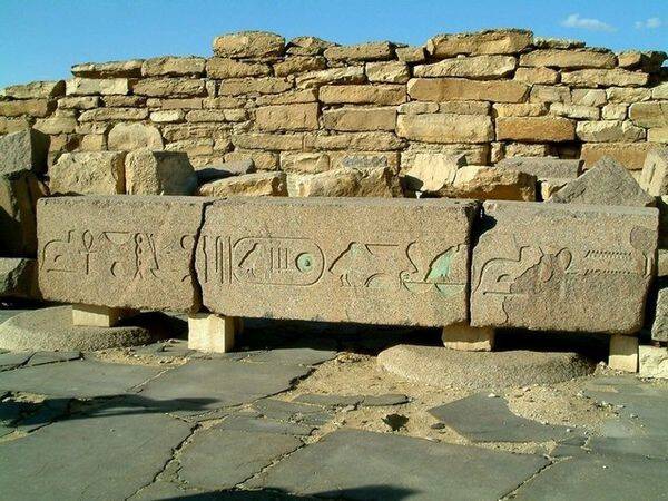 Reconstitution des hiéroglyphes des linteaux retrouvés du temple funéraire.