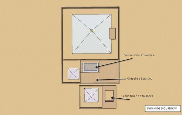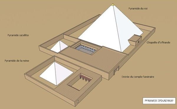Le complexe funéraire d’Ouserkaf se situe à Saqqarah, à l’angle Nord/Ouest du complexe de Djeser. Ouserkaf a effectué une continuation dans le changement en choisissant un autre emplacement pour sa pyramide que celui de ces prédécesseurs, comme l’avait fait avant lui Shepseskaf, dernier roi de la 4ème dynastie. Le complexe est très différent de tous les autres par divers points. Le temple funéraire est axé au Sud, alors que tous les autres le sont à l’Est et une chapelle d’offrande se trouve sur la face Est de la pyramide alors que la tradition la plaçait dans le temple funéraire. On suppose que le complexe était relié à un temple de la vallée par une chaussée, mais on n’a, à ce jour, retrouvé aucune trace de l’un ou de l’autre. Certains pensant qu’ils n’ont jamais existé, c’est pour cette raison que je ne les ai pas représentés dans le modèle 3D.