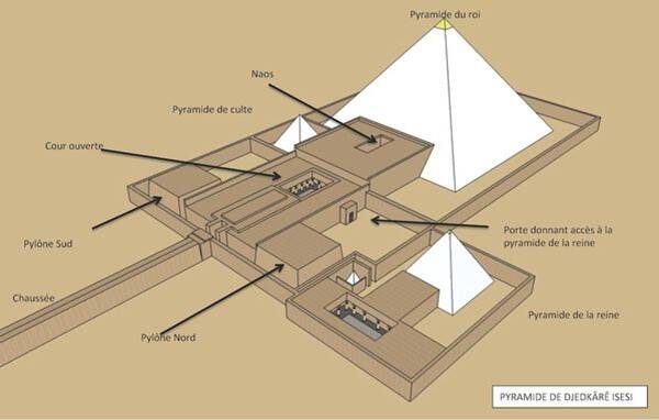 La pyramide est très ruinée actuellement. Ses dimensions devaient être de 79m x 52,50m avec une pente de 52°et est axée Est ouest. Elle fut construite comme une pyramide à degrés avant d’être lissée, technique utilisée durant la 5ème dynastie depuis Néférirkârê Kakaï. Son entrée se trouve au sol et orientée au Nord. L’entrée possède une petite chapelle qui donne sur un couloir en granit qui aboutit à une chambre horizontale. Le couloir reprend ensuite pour arriver à trois herses de granit pour continuer encore jusqu’à l’antichambre. A l’Est on trouve trois niches à statues et à l’Ouest la chambre funéraire. Chambre et antichambre sont couvertes de faisceaux de pierres calcaires disposées en chevrons qui sont distincts les uns des autres. Le sarcophage est en basalte a été découvert complètement détruit mais a pu être reconstruit car on avait suffisamment de fragments. Un emplacement pouvant recevoir les vases canopes a été creusé dans le sol. On a retrouvé dans la chambre funéraire des restes de momies (d’un homme), ce qui laisse à croire qu’il s’agirait des restes du roi. Le temple funéraire possédait deux pylônes massifs comme pour celui de Niousserrê. En arrivant de la chaussée on trouvait l’entrée et ensuite long et étroit couloir équipé de magasins sur ses côtés. À la suite, on trouvait une cour ouverte à colonnes de granit destinée à la présentation des offrandes. Le tout était pavé d’albâtre. Les décorations du temple étaient aussi riches que celles des temples d’Abousir. Ensuite, on arrivait à une longue salle transversale marquant une séparation entre les temples intérieur et extérieur. Sur le côté Nord de la cour à colonne on avait accès à un petit portique à deux colonnes qui donnait sur une grande cour ouverte unique accès au complexe funéraire de la reine. Par la salle transversale, on accédait par une porte unique à la partie intérieure du temple funéraire. On y trouvait la chapelle aux 5 statues et à une antichambre avec une colonne unique qui contenait le naos et la stèle fausse porte. Des magasins se trouvaient aussi dans le temple intérieur et contenaient les objets du culte. Le complexe possédait une pyramide satellite.