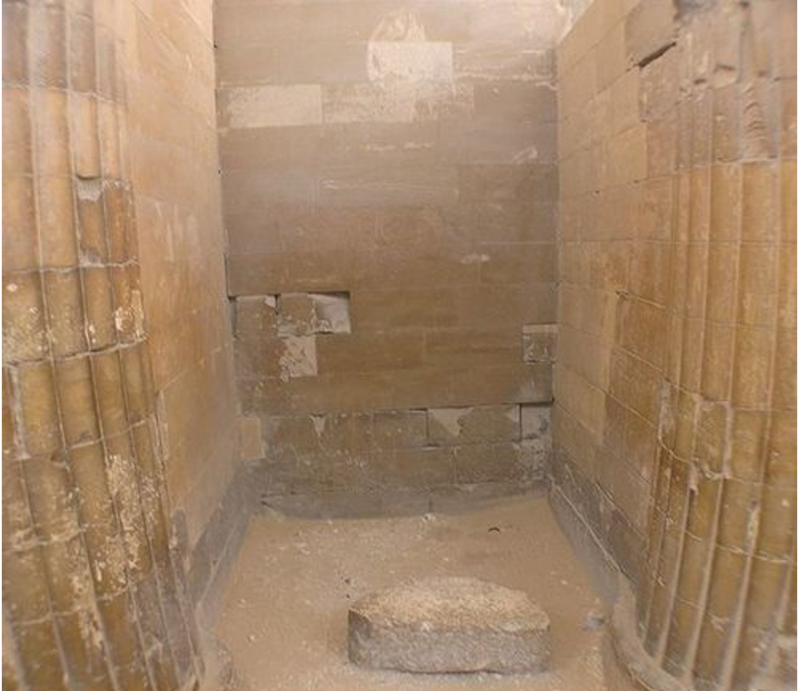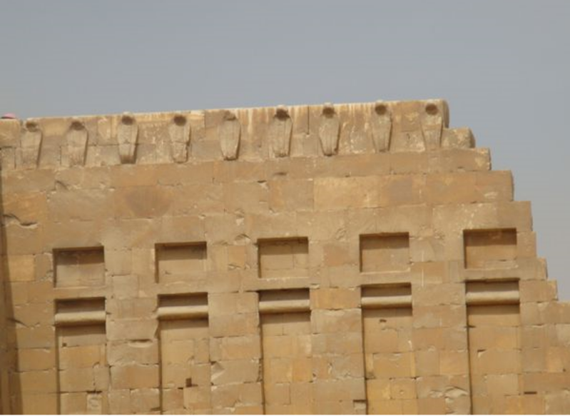 Passé la porte d’entrée du portique, on aperçoit la forme des gongs et de la porte, sculptée dans la pierre, comme pour la représenter ouverte pour l’éternité. Il s'agit là encore d'un symbole représentant la cité de Memphis où le roi vivra son « au-delà ».