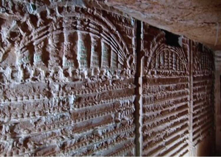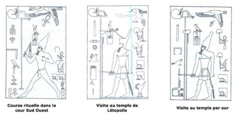 Dans celui de gauche, sur les murs, sont représentées des façades de chapelles aux toits arquées supportées par des piliers Djed, qui symbolisent la stabilité et la durée de l’univers.