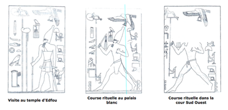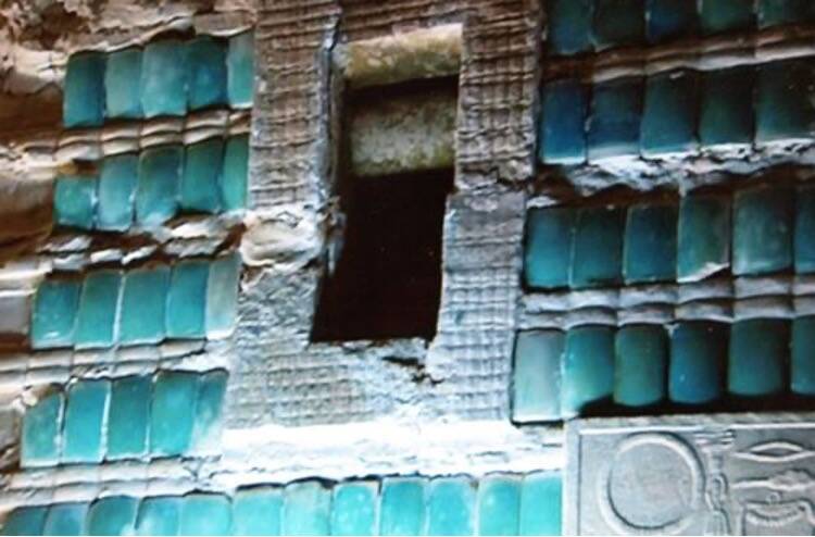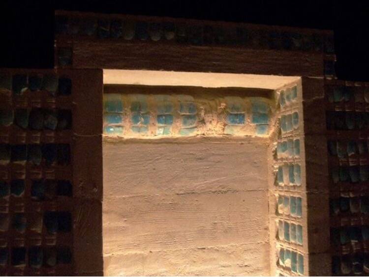 On y trouve de splendides plaquettes de faïence imitant des nattes de roseaux encadrant les portes du palais dans lesquelles se tient le pharaon. Elles sont représentées grandes ouvertes comme on peut le voir sur les hauteurs avec la représentation de nattes enroulées.