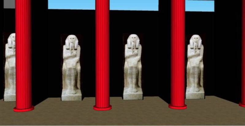 L'entrée principale, un passage étroit d'un mètre (2 coudées) et long d'une dizaine de mètres environ, donnait accès à un long corridor. Les murs latéraux de celui-ci étaient ornés de vingt fausses colonnes fasciculées imitant des faisceaux de roseaux, disposées en saillie aux murs et hautes de 6,60 m. Il ne s'agit donc pas encore de véritables colonnes proprement dites, elles étaient insérées dans un muret qui les supportait. Peintes en rouge, les murs du corridor l'étaient en noir, comme pour mieux s'effacer. Entre ces murets, on avait créé dans l'espace des niches qui accueillaient chacune une statue du roi.