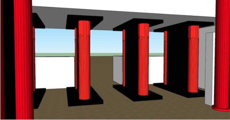 A la suite des vingt colonnes, un petit hall comprenait 4 colonnes doubles qui étaient placées perpendiculairement aux autres, et ensuite on entrait dans la cour principale.